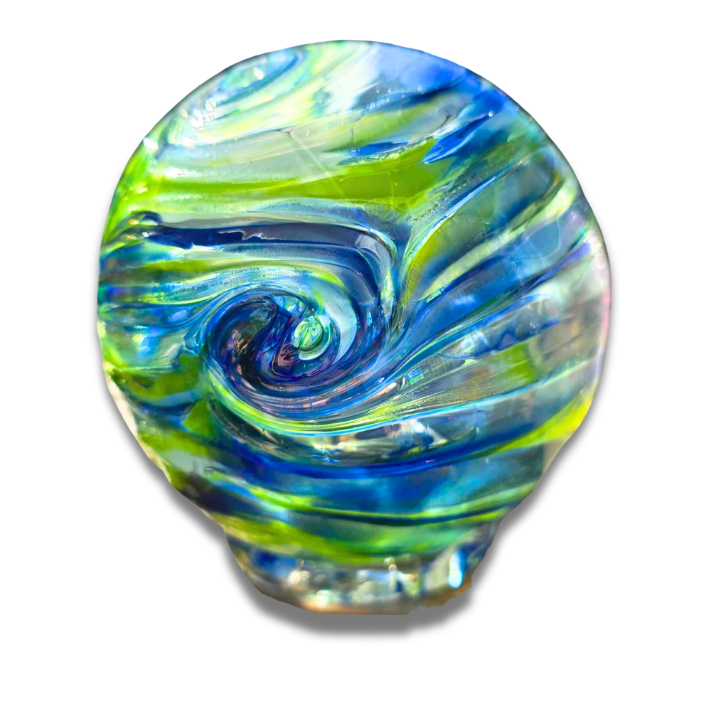 A glass float is a buoyant, spherical object traditionally used in fishing, specifically for holding fishing nets afloat. These floats are typically made of glass and are often round or slightly oval. They come in various colors. The surface is can be smooth, with some having patterns or bubbles trapped inside the glass during the manufacturing process, giving them a unique, handcrafted appearance.